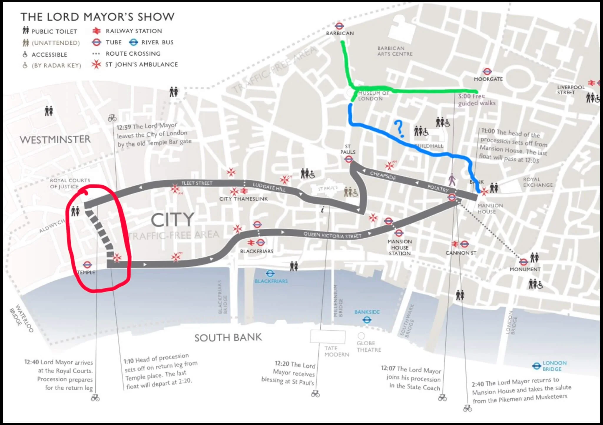 To contradict myself, the middle of the Lord Mayor’s Show (aka lunch break) is also pretty good. The atmosphere loosens up, and you can move more feely. The best place to be at that time is around Temple (circled above in red). Maybe “the end of the first half” is more appropriate, so my earlier stance still stands!