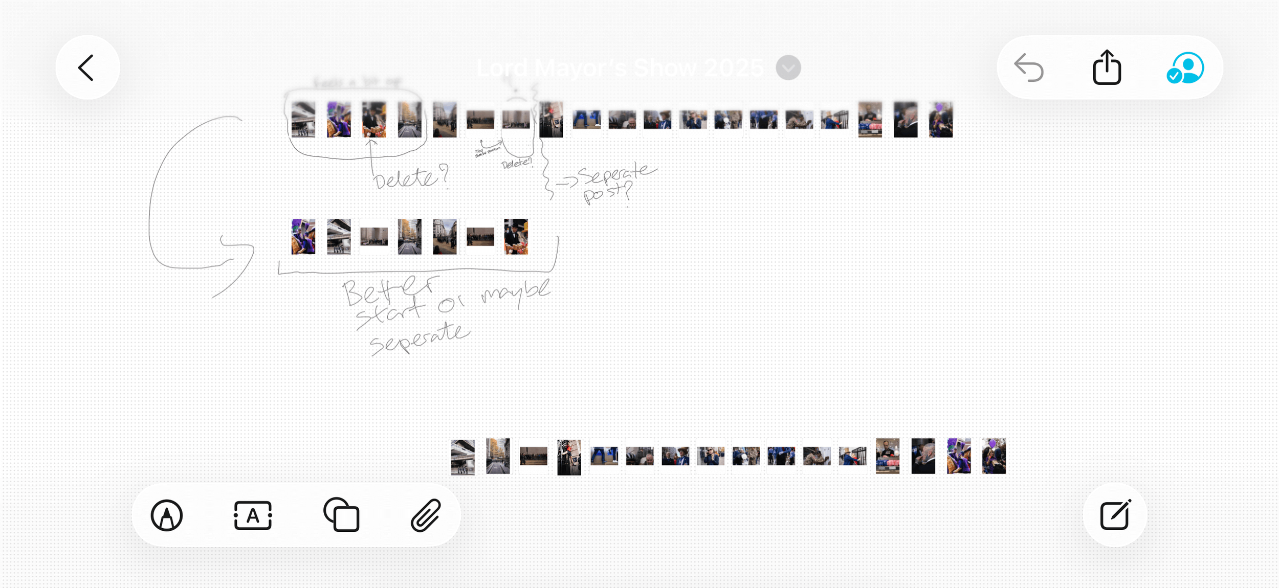 I won’t go into a lot of detail, but I gave it a go on my iPad and brought in a selection of images for my Lord Mayor’s Post. Once in, I moved them around until I landed on a final sequence. If you’ve read my previous blog post about how much I enjoyed sequencing my Carnival Zine, this app is pressing all the right buttons for me.